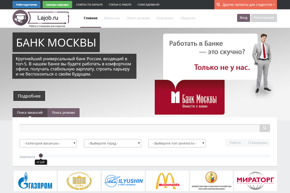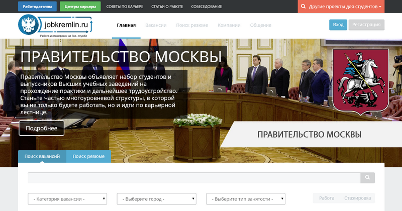 «После окончания института долго мучилась с поиском нормальной работы, пока не забрела на сайт Jobkremlin.ru. Оказалось, даже у выпускников есть огромный выбор вариантов трудоустройства»